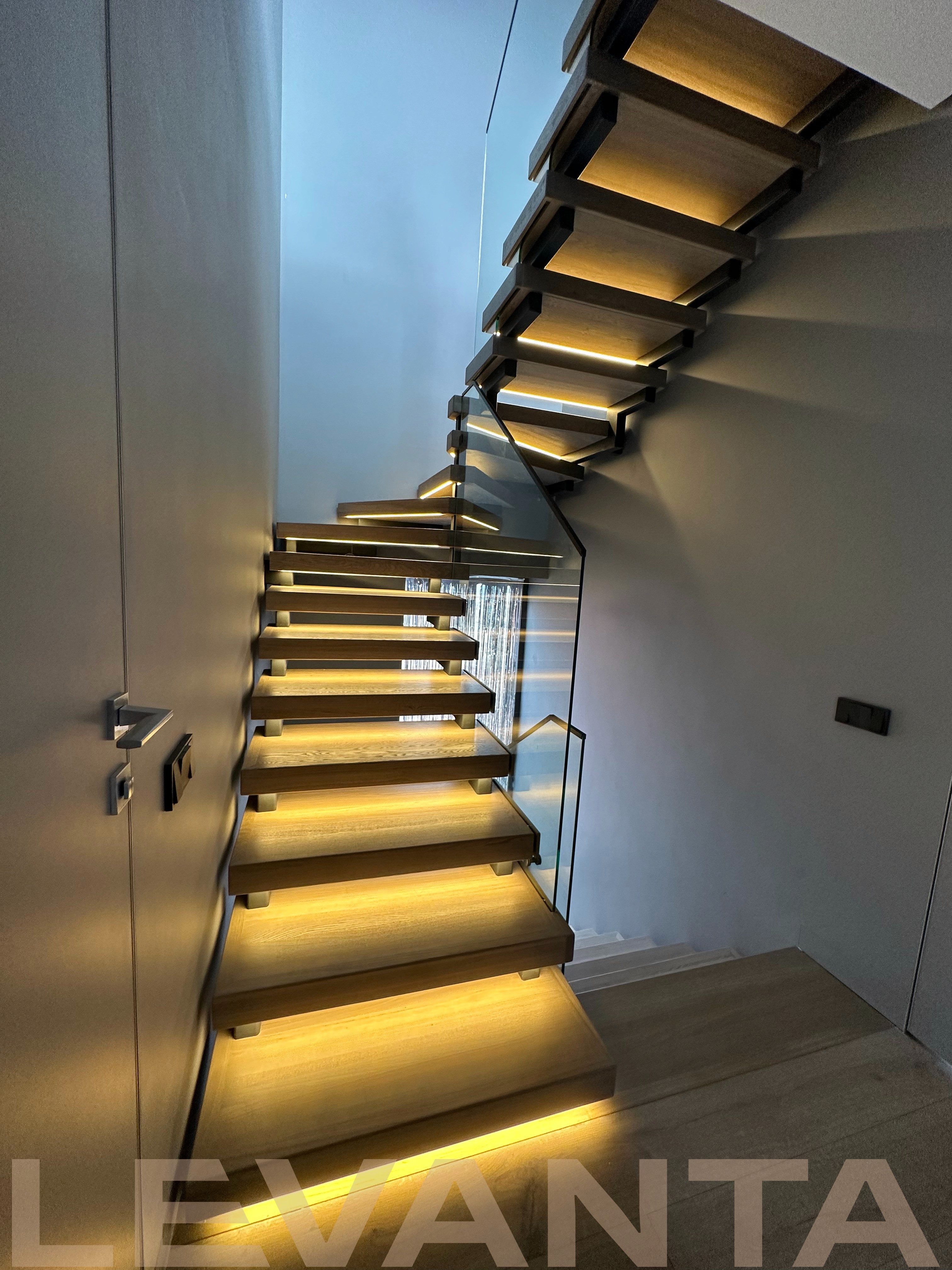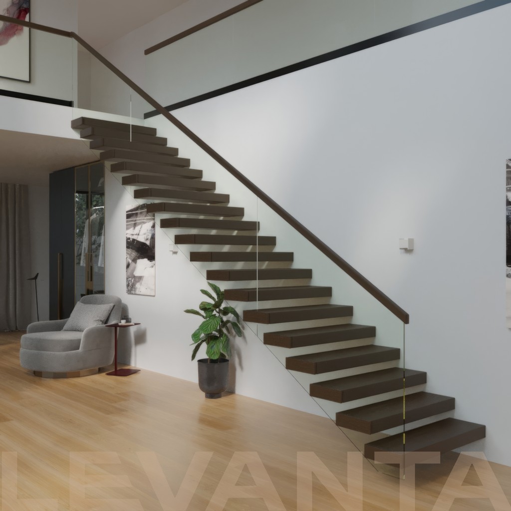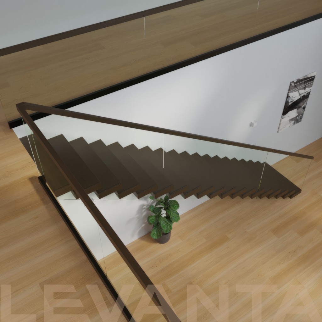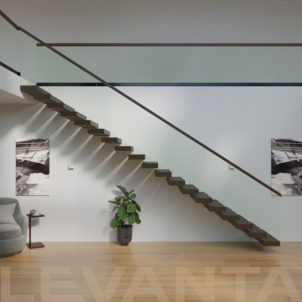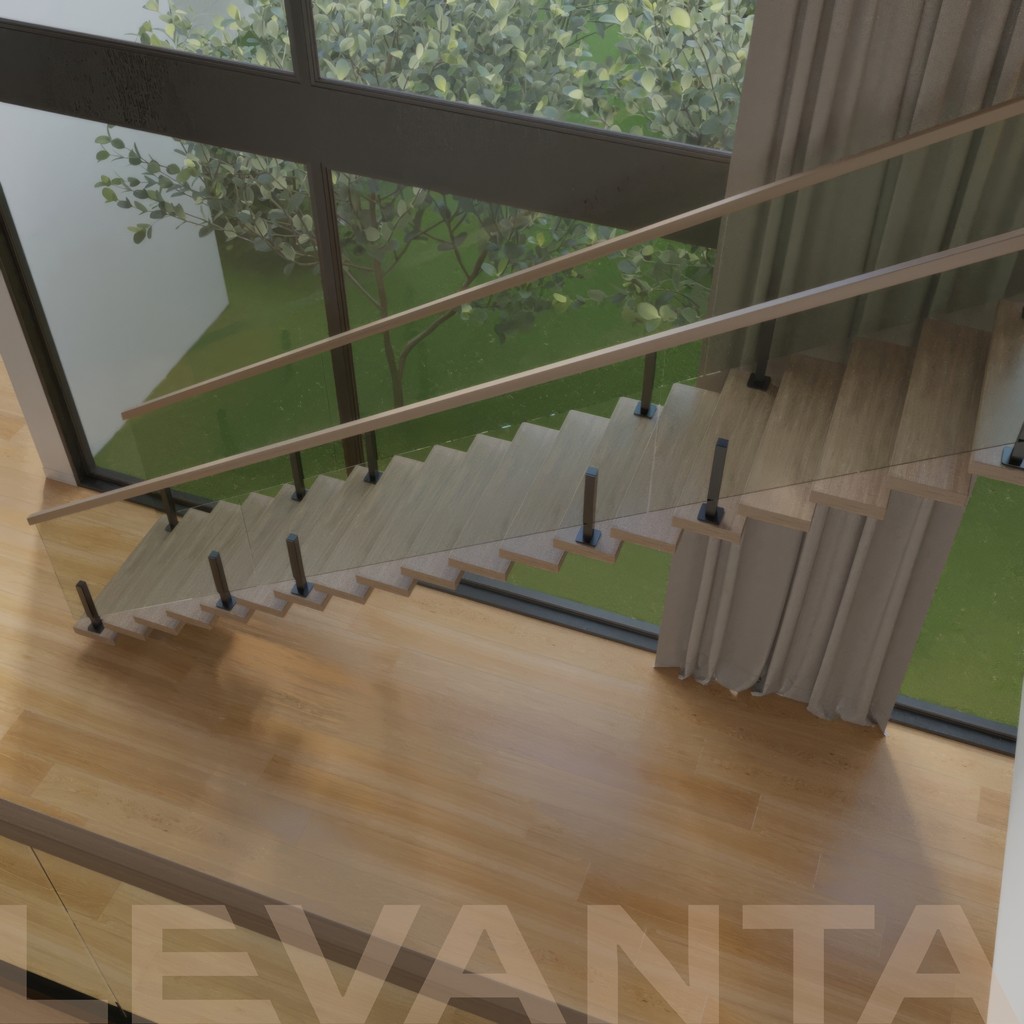Металлический каркас обшит деревом, стеклянные ограждения крепятся в торец ступени. Выглядит современно и визуально облегчает пространство.