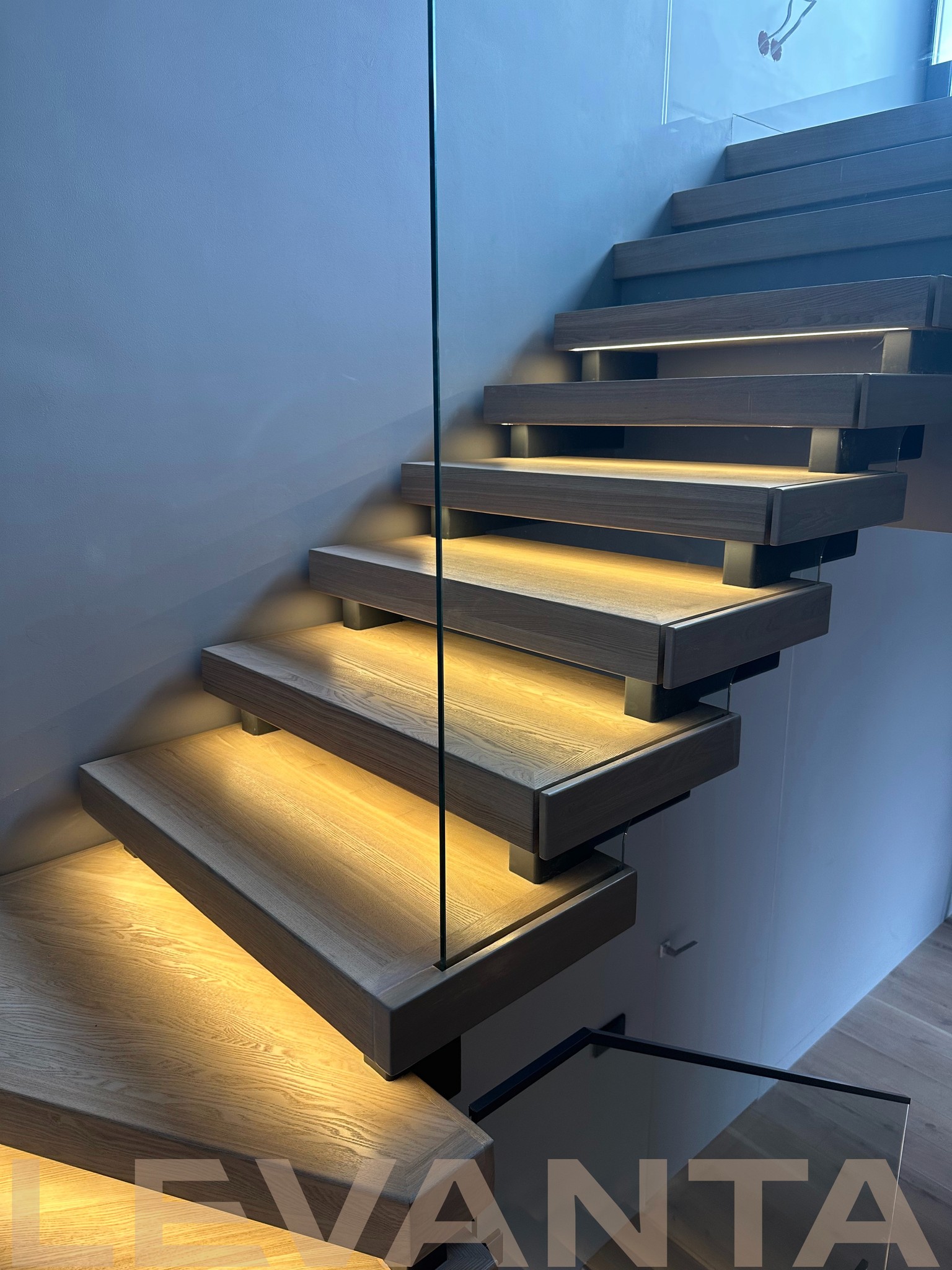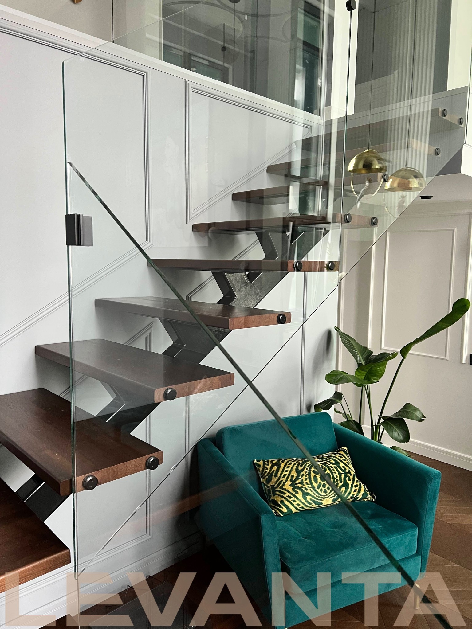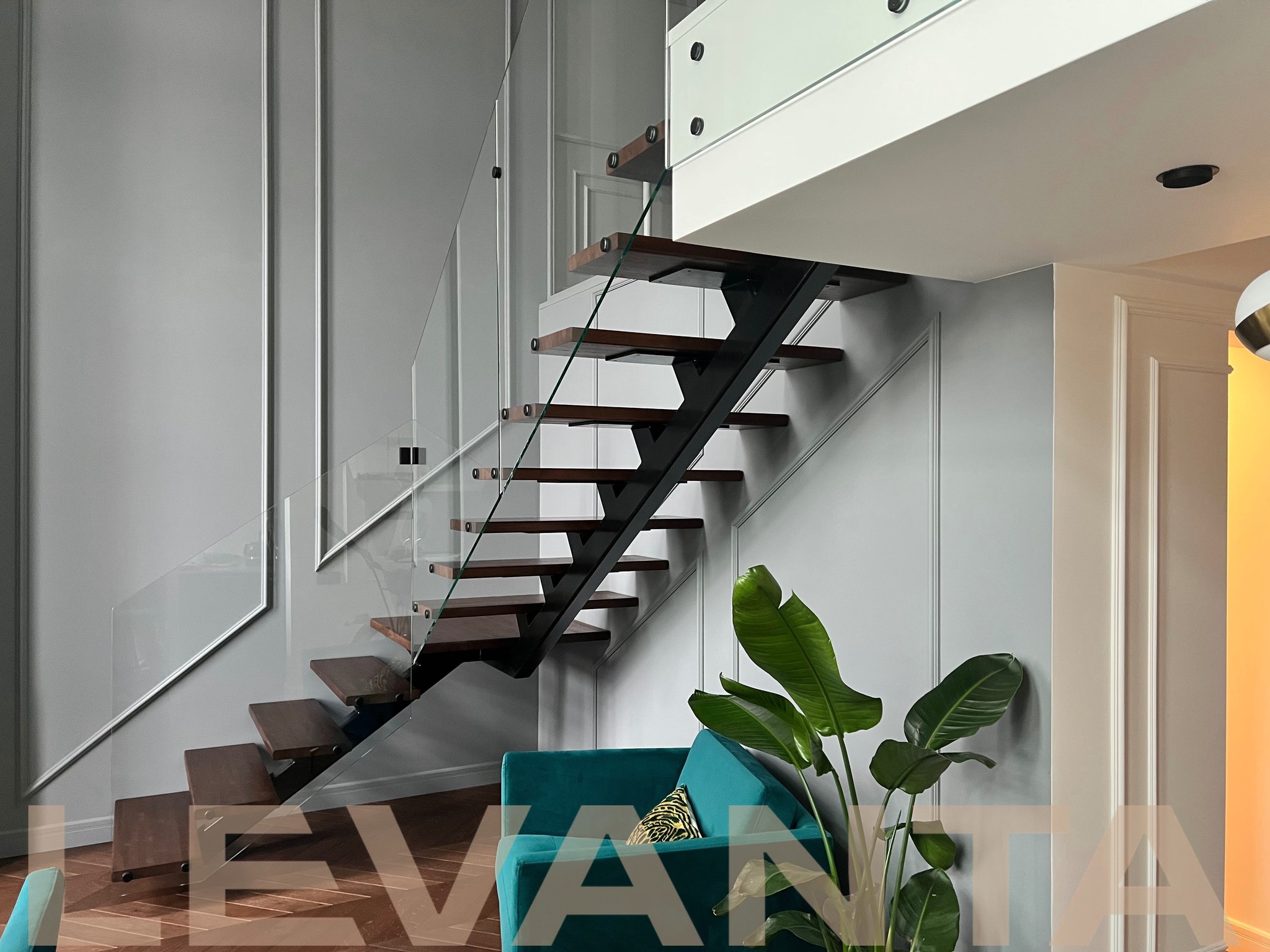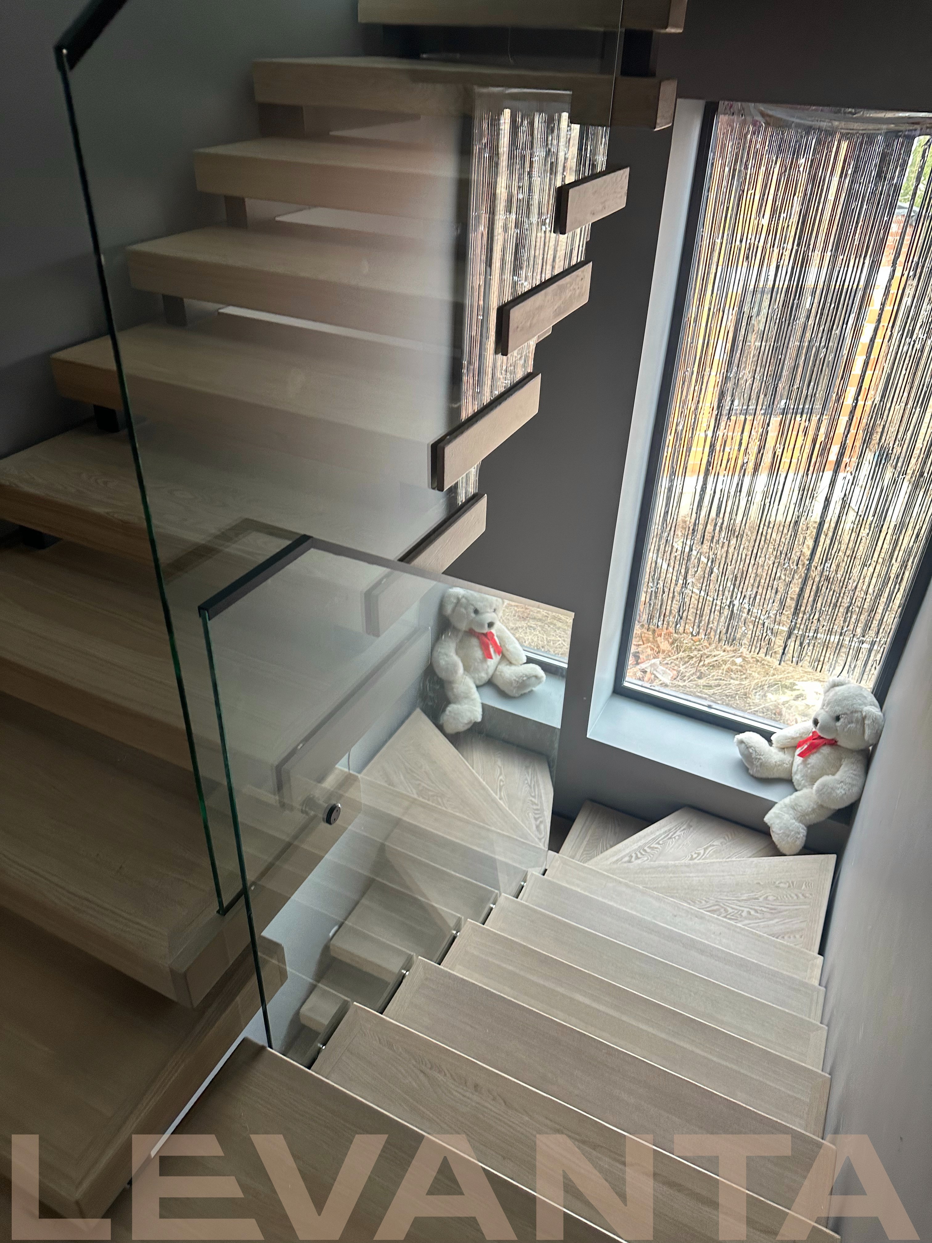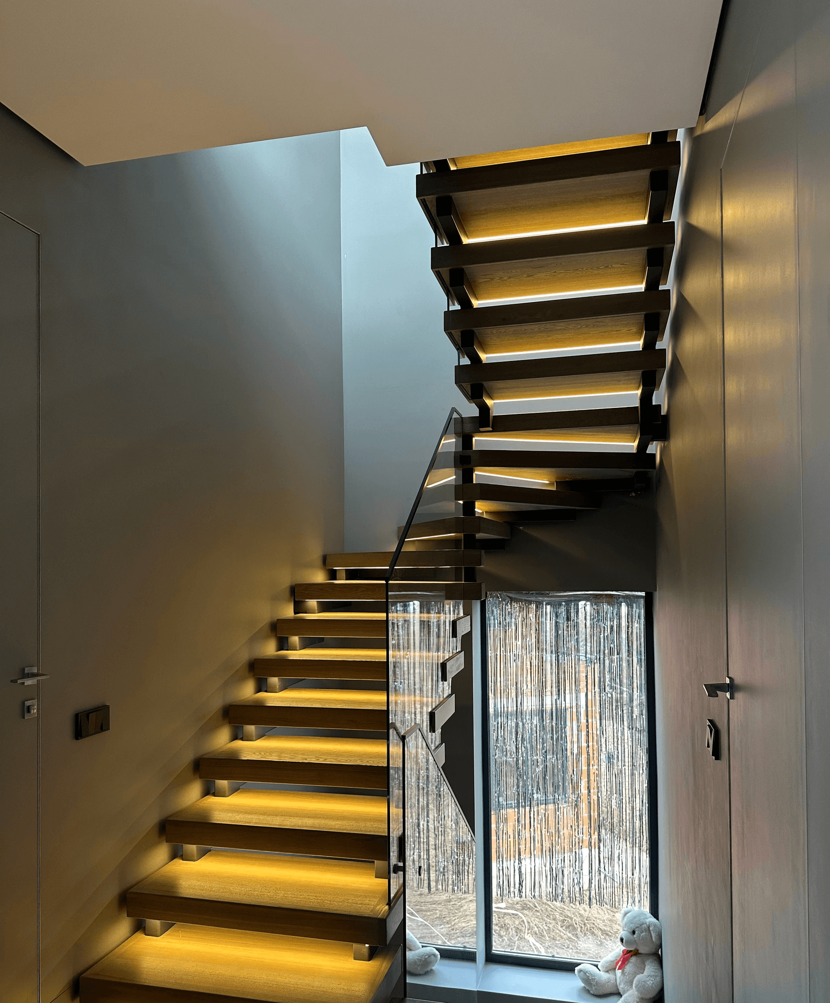 Металлический каркас обшит деревом, стеклянные ограждения крепятся в торец ступени. Выглядит современно и визуально облегчает пространство.