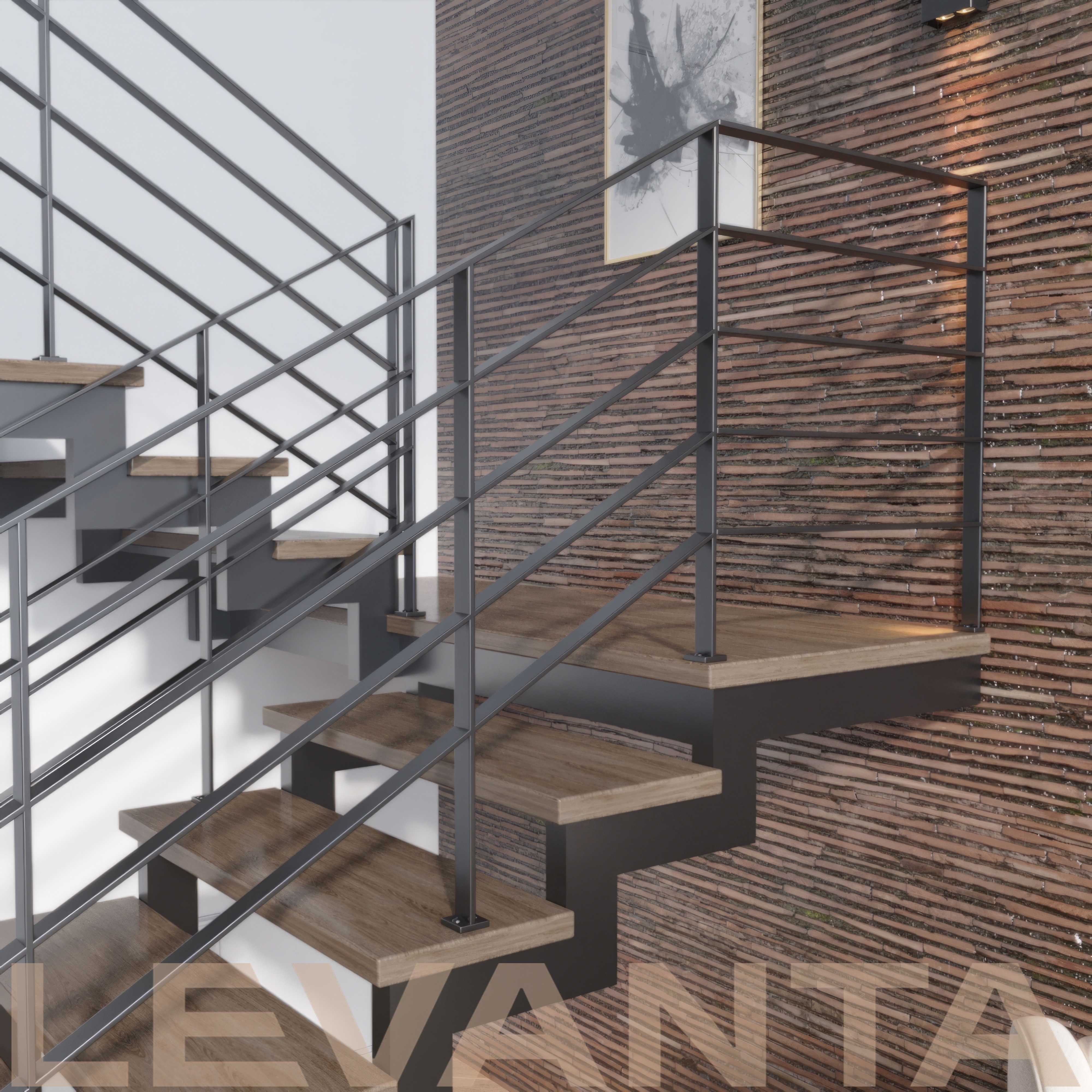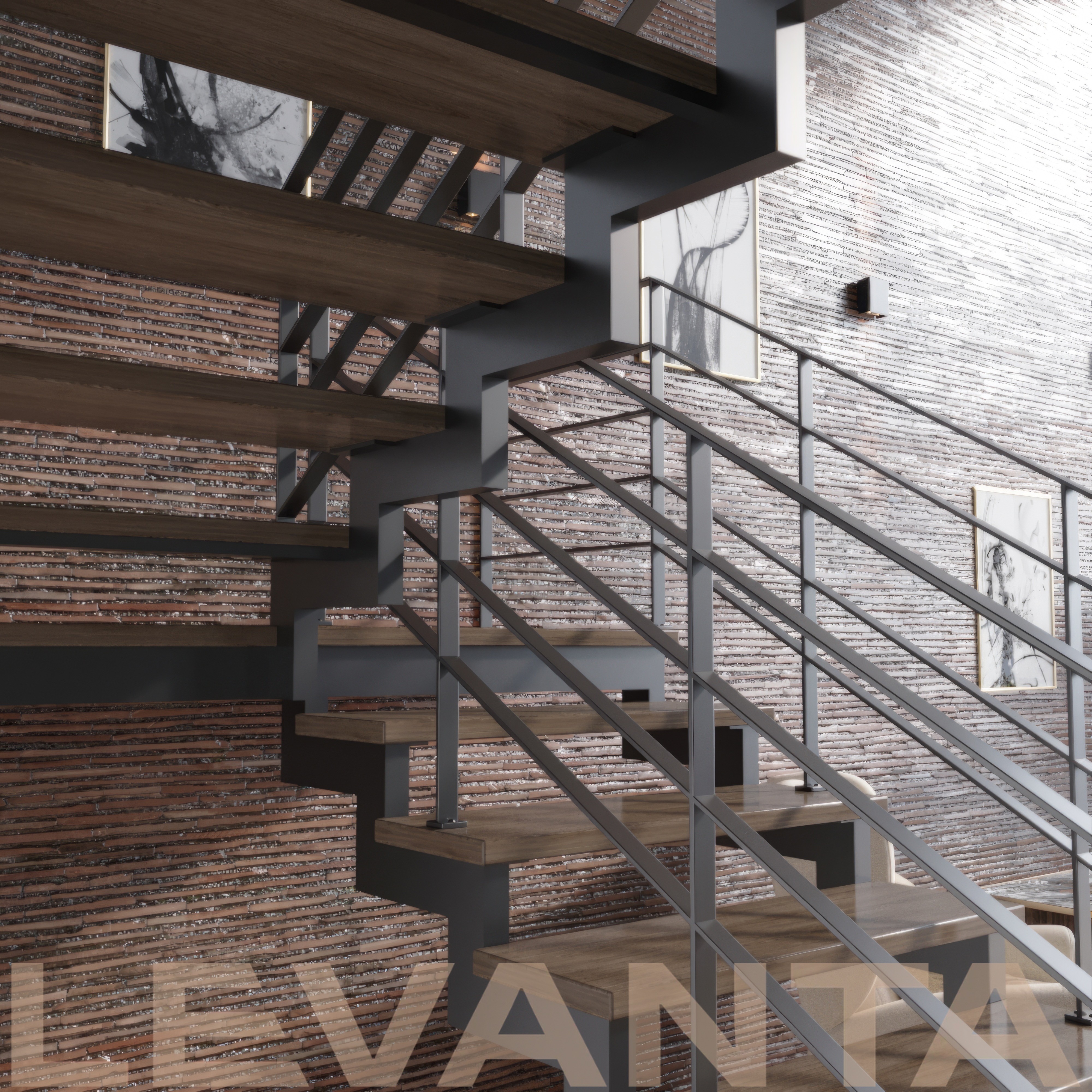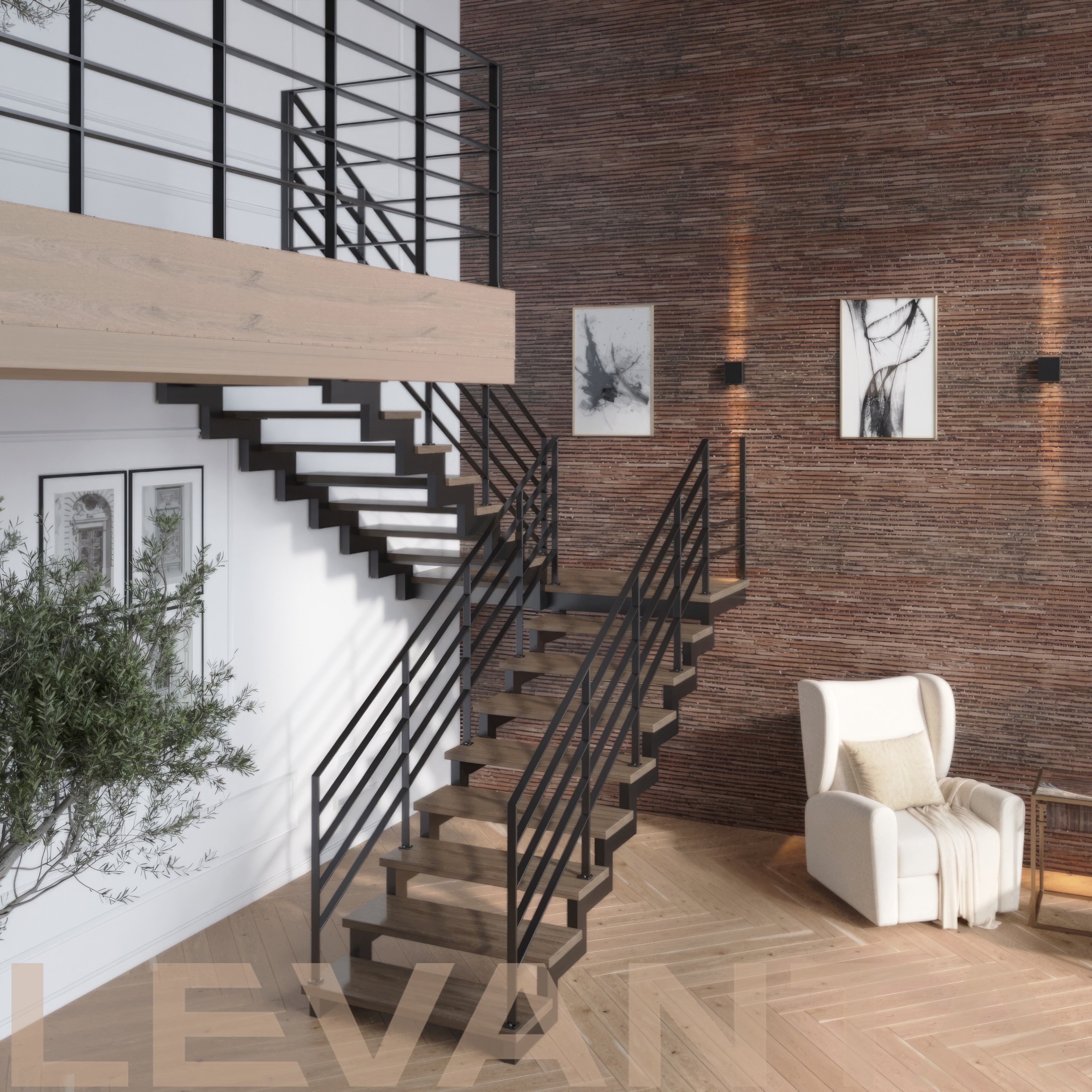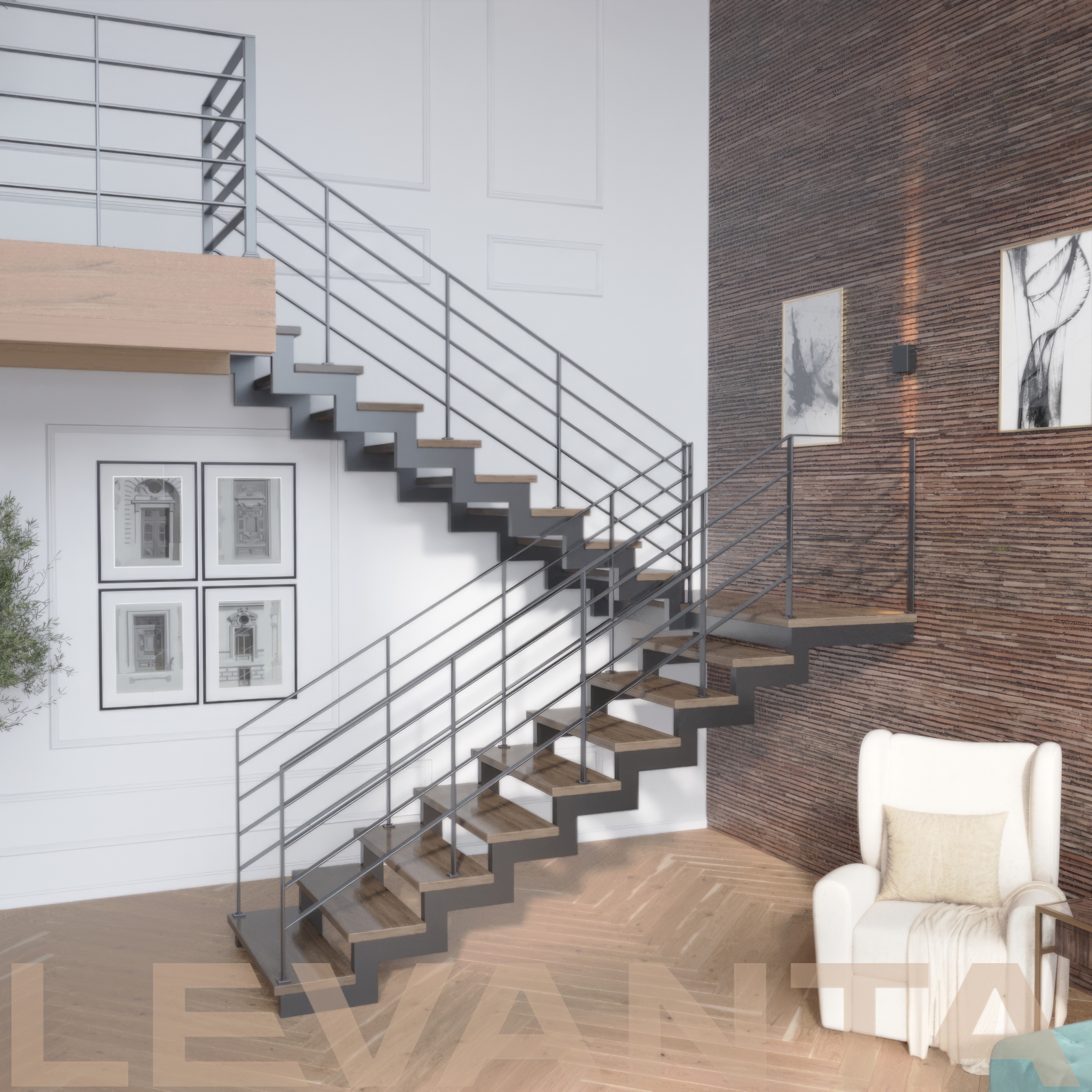 Открытая лестница на двух зигзагообразных косоурах из листового металла с деревянными ступенями и реечными металлическими ограждениями до потолка.