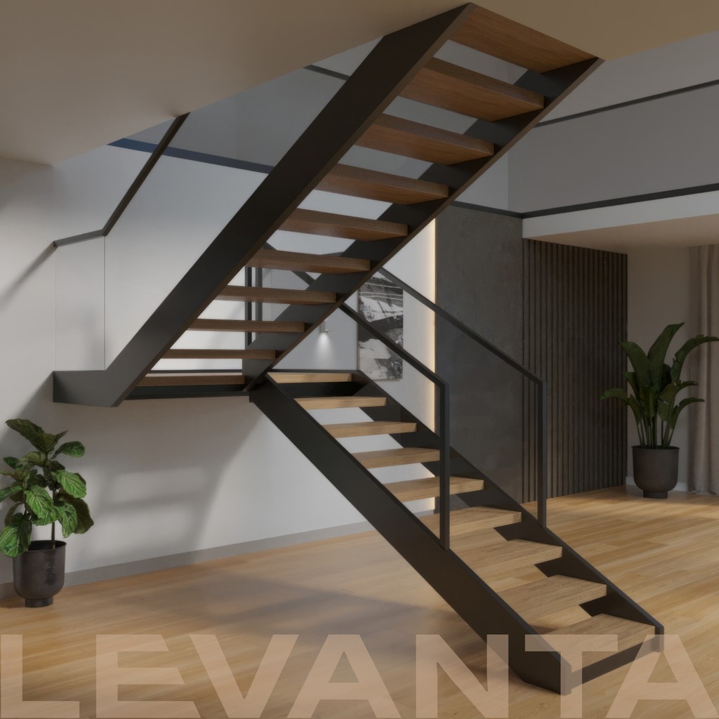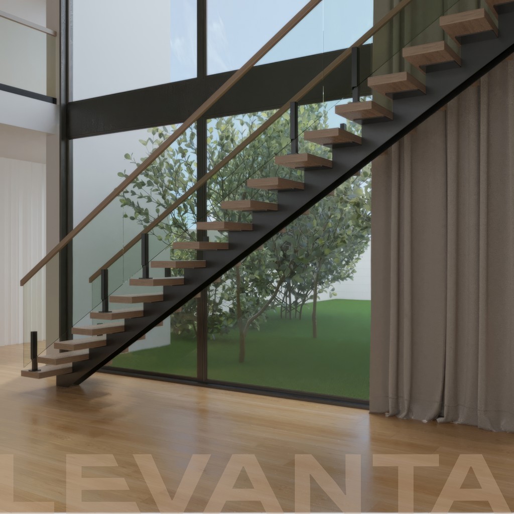Современная лестница на металлическом монокосоуре из профильной трубы. Лёгкая и прочная конструкция с центральной несущей балкой под ступенями.